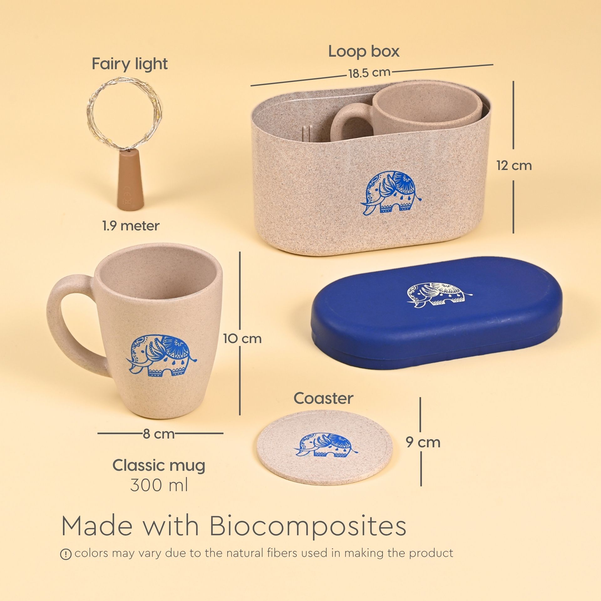 Earth Friendly Gifts | Elephant Printed Mug and Coasters Set of 2 | Fairy Lights, Keychain, Loopac Box | 300 ml | For Family and Friends | Mugs for Gifts | Made with Rice Husk
