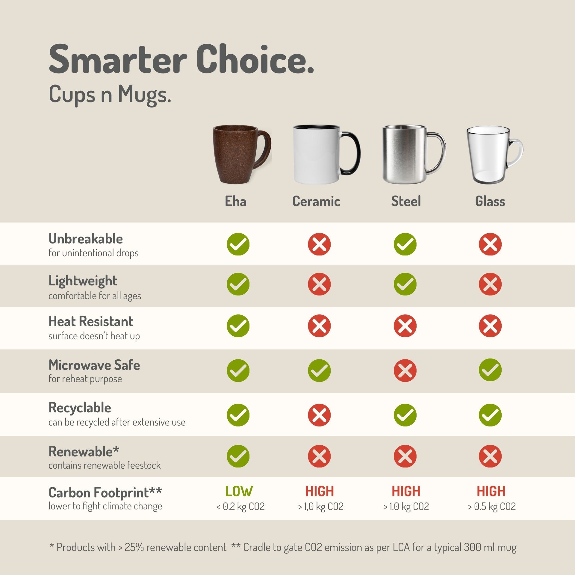 The eha cups and mugs are made with our proprietary biocomposite materials. Biocomposites used for food contact products are a blend of natural fibers and polypropylene, which is extensively tested and used in healthcare and food industry. They are free from BPA, pthalates, styrene, melamine and PFAS.